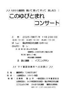 後援:広島県・福山市・一般社団法人日本童謡協会・公益財団法人ふくやま芸術文化財団・福山市神辺文化会館・エフエムふくやま・神辺文化連盟・葛原文化保存会
