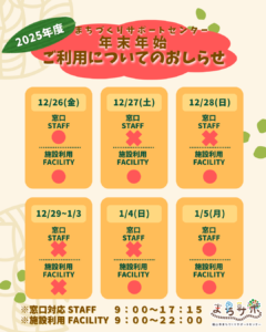 福山市まちづくりサポートセンターでは、年末年始休業日を下記のとおりとさせていただきます。
